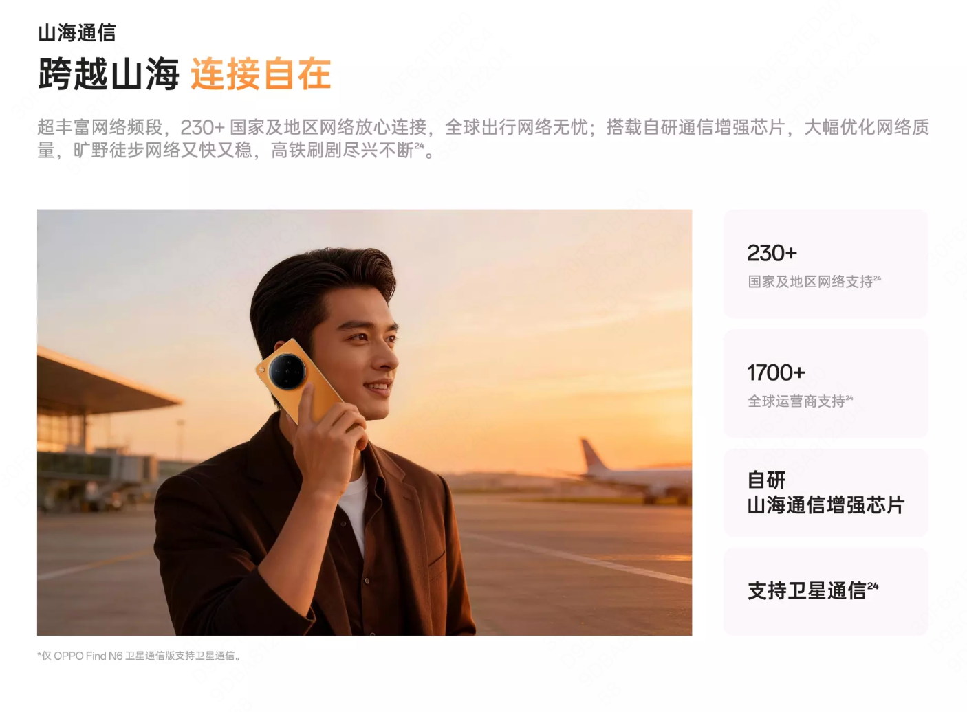 通信能力方面,OPPO Find N6搭载自研山海通信增强芯片,配合多重通信增强技术,核心频段信号强度提升100%,支持66个通信频段,覆盖全球230多个国家和地区,是目前全球支持网络频段最多的折叠屏手机,真正实现“走遍全球,一部N6就够了”。