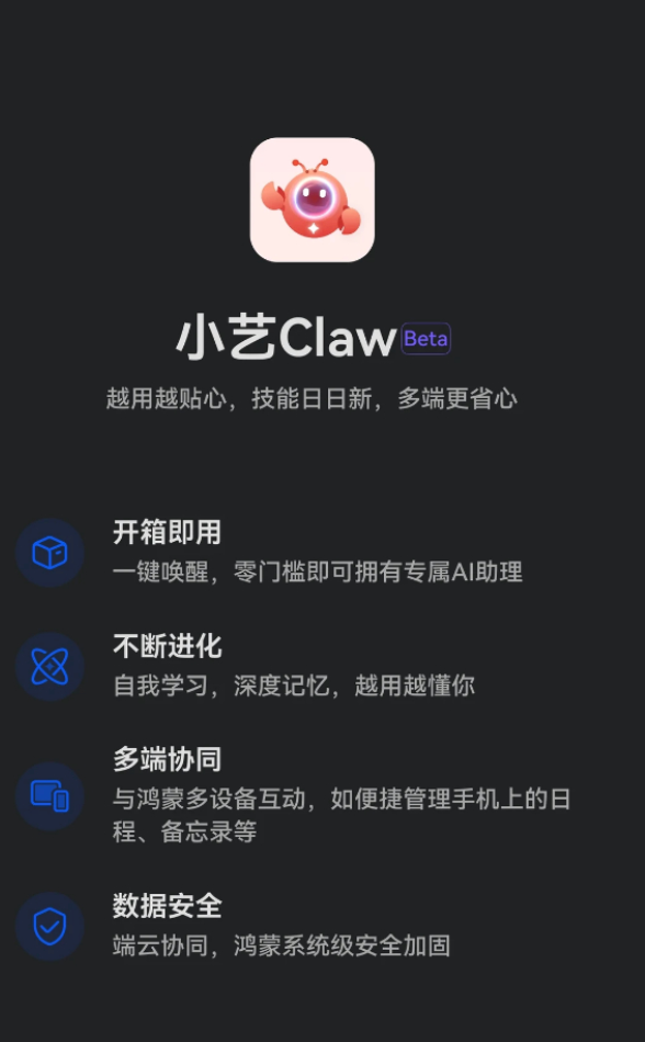 用户可在小艺 App 内输入“小艺 Claw 预约”进行预约。据介绍,小艺 Claw 支持开箱即用,可一键唤醒;支持自我学习、深度记忆,可不断进化;支持多端协同,可与鸿蒙多设备互动,如便捷管理手机的日程、备忘录等;支持端云协同,拥有鸿蒙系统级安全加固。