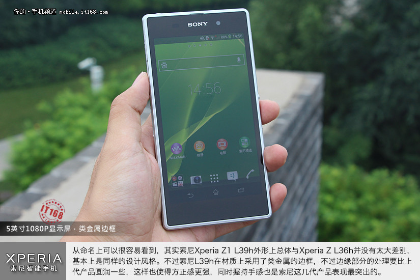 从命名上可以很容易看到,其实索尼Xperia Z1 L39h外形上总体与Xperia Z L36h并没有太大差别,基本上是同样的设计风格。不过索尼L39h在材质上采用了类金属的边框,不过边缘部分的处理要比上代产品圆润一些,这样也使得方正感更强,同时握持手感也是索尼这几代产品表现最突出的。