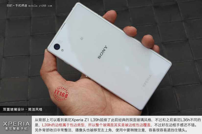 从背部上可以看到索尼Xperia Z1 L39h延续了此前经典的双面玻璃风格,不过和之前索尼L36h不同的是,L39h的边框属于包边类型,所以整个玻璃面其实是被边框包边覆盖,不过好在边框手感还不错。另外背部依旧非常整洁,摄像头也被移至左上角,使用中要稍微注意,容易很容易遮挡住镜头。