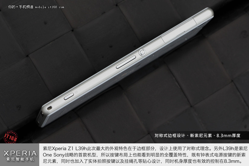 索尼Xperia Z1 L39h此次最大的外观特色在于边框部分,设计上使用了对称式理念。另外L39h是索尼One Sony战略的首款机型,所以按键布局上也能看到明显的全覆盖特性,既有钟表式电源按键的新索尼元素,同时也加入了实体拍照按键以及挂绳孔等贴心设计,同时机身厚度也有效的控制在8.3mm。