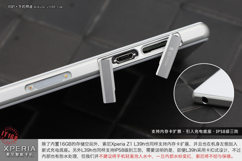 除了内置16GB的存储空间外,索尼Xperia Z1 L39h也同样支持内存卡扩展,并且也在机身左侧加入新式充电底座。另外L39h也同样支持IP58级别三防,需要说明的是,即便L39h采用卡扣式设计,不过内部也有防水处理,但我们并不建议将手机轻易泡入水中,一旦内部水标变红,索尼将不给与保修。
