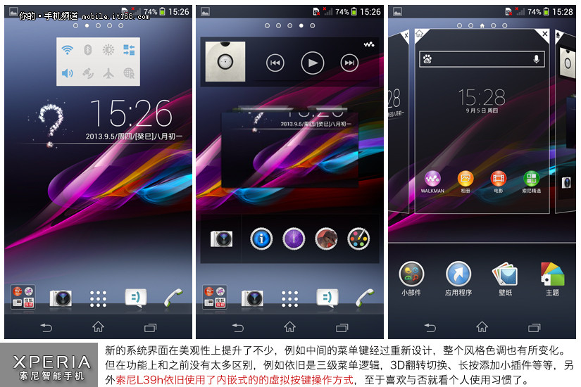 新的系统界面在美观性上提升了不少,例如中间的菜单键经过重新设计,整个风格色调也有所变化。但在功能上和之前没有太多区别,例如依旧是三级菜单逻辑,3D翻转切换、长按添加小插件等等,另外索尼L39h依旧使用了内嵌式的的虚拟按键操作方式,至于喜欢与否就看个人使用习惯了。