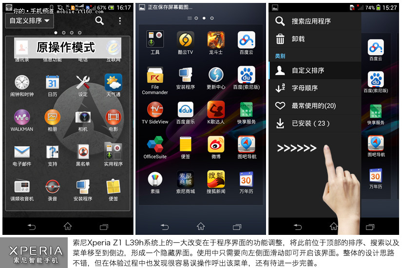 索尼Xperia Z1 L39h系统上的一大改变在于程序界面的功能调整,将此前位于顶部的排序、搜索以及菜单移至到侧边,形成一个隐藏界面。使用中只需要向左侧面滑动即可开启该界面。整体的设计思路不错,但在体验过程中也发现很容易误操作呼出该菜单,还有待进一步完善。