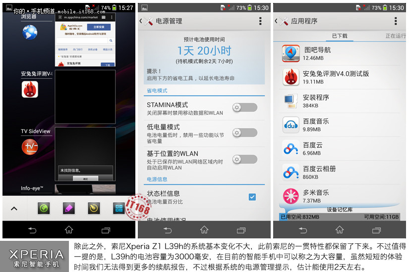 除此之外,索尼Xperia Z1 L39h的系统基本变化不大,此前索尼的一贯特性都保留了下来。不过值得一提的是,L39h的电池容量为3000毫安,在目前的智能手机中可以称之为大容量,虽然短短的体验时间我们无法得到更多的续航报告,不过根据系统的电源管理提示,估计能使用2天左右。