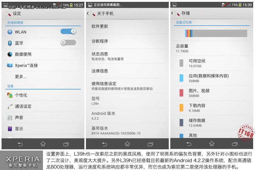 设置界面上,L39h也一改索尼之前的黑底风格,使用了明亮系的偏灰色背景,另外针对小图标也进行了二次设计,美观度大大提升。另外L39h已经搭载目前最新的Android 4.2.2操作系统,配合高通骁龙800处理器,运行速度和系统响应都非常优异,而它也成为索尼第二款使用该处理器的手机。