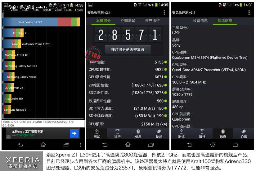 索尼Xperia Z1 L39h使用了高通骁龙800处理器,四核2.1Ghz,而这也是高通最新的旗舰型产品,目前已经逐步应用到各大厂商的旗舰机中。该处理器最大特点就是使用Krait400架构和Adreno330 图形处理器,L39h的安兔兔跑分为28571,象限测试得分为17772,性能非常强劲。