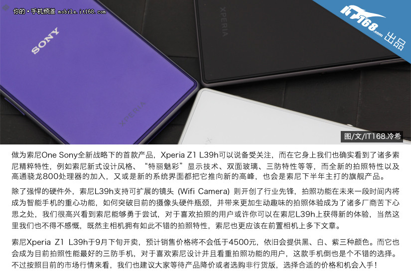 做为索尼One Sony全新战略下的首款产品,Xperia Z1 L39h可以说备受关注,而在它身上我们也确实看到了诸多索尼精粹特性,例如索尼新式设计风格、“特丽魅彩”显示技术、双面玻璃、三防特性等等,而全新的拍照特性以及高通骁龙800处理器的加入,又或是新的系统界面都把它推向新的高峰,也会是索尼下半年主打的旗舰产品。 除了强悍的硬件外,索尼L39h支持可扩展的镜头 (Wifi Camera) 则开创了行业先锋,拍照功能在未来一段时间内将成为智能手机的重心功能,如何突破目前的摄像头硬件瓶颈,并带来更加生动趣味的拍照体验成为了诸多厂商苦下心思之处,我们很高兴看到索尼能够勇于尝试,对于喜欢拍照的用户或许你可以在索尼L39h上获得新的体验,当然这里我们也不得不感慨,既然主相机拥有如此不错的拍照特性,索尼也更应该在前置相机上多下文章。 索尼Xperia Z1 L39h于9月下旬开卖,预计销售价格将不会低于4500元,依旧会提供黑、白、紫三种颜色。而它也会成为目前拍照性能最好的三防手机,对于喜欢索尼设计并且看重拍照功能的用户,这款手机倒也是个不错的选择。不过按照目前的市场行情来看,我们也建议大家等待产品降价或者选购非行货版,选择合适的价格和机会入手!