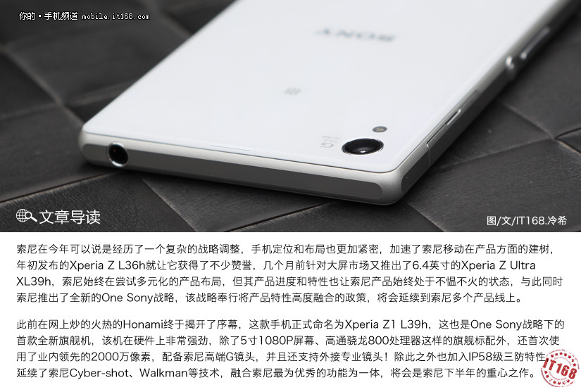 索尼在今年可以说是经历了一个复杂的战略调整,手机定位和布局也更加紧密,加速了索尼移动在产品方面的建树,年初发布的Xperia Z L36h就让它获得了不少赞誉,几个月前针对大屏市场又推出了6.4英寸的Xperia Z Ultra XL39h,索尼始终在尝试多元化的产品布局,但其产品进度和特性也让索尼产品始终处于不愠不火的状态,与此同时索尼推出了全新的One Sony战略,该战略奉行将产品特性高度融合的政策,将会延续到索尼多个产品线上。 此前在网上炒的火热的Honami终于揭开了序幕,这款手机正式命名为Xperia Z1 L39h,这也是One Sony战略下的首款全新旗舰机,该机在硬件上非常强劲,除了5寸1080P屏幕、高通骁龙800处理器这样的旗舰标配外,还首次使用了业内领先的2000万像素,配备索尼高端G镜头,并且还支持外接专业镜头!除此之外也加入IP58级三防特性,延续了索尼Cyber-shot、Walkman等技术,融合索尼最为优秀的功能为一体,将会是索尼下半年的重心之作。