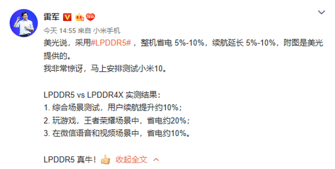 小米集团总裁雷军发布微博,放出了小米10工程机分别搭载LPDDR5、LPDDR4X内存的实测结果: