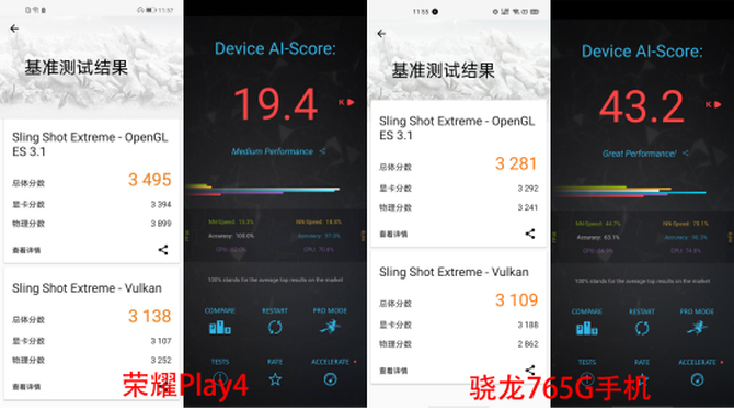 跑分作为性能体验的基础,简单测试了一下3DMark和AI benchmark两款跑分软件,从上面实际的分数就可以看出来,两款手机的性能都在中端性能正常发挥的水平之内,骁龙765G的3DMark跑分相对于荣耀Play4的跑分略低一些,整体差距不是很大,然而对于AI benchmark,两家对AI运算能力上还是有一定的差距,骁龙765G整体AI运算能力是荣耀Play4天玑800的2倍左右。如果说跑分不代表一切,那么下面真实的游戏体验才是开启测试性能更佳方式。
