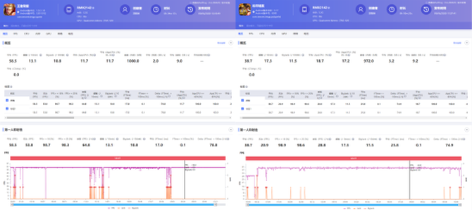 两款手机对于王者荣耀的适配还是很好的,平均的帧率都可以维持59帧左右,帧率波动都不是很明显,但是在和平精英方面,帧率表现就很一般,骁龙765G手机则相对要高一些,两款手机帧率测试也算符合中端处理器的实际性能表现。如果说王者荣耀可以满帧运行,那么和平精英算是可以流畅运行了。