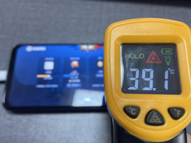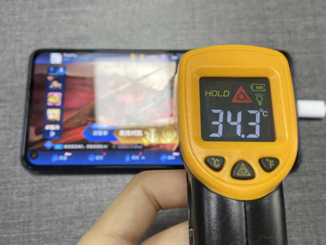 散热方面,在室内温度为27.2摄氏度左右,荣耀Play4得益于这次三大散热系统的加入,30分钟王者荣耀高温度为34.3摄氏度。骁龙765G手机也同样采用全新散热工艺,配合多重散热,30分钟王者荣耀高温度为39.1摄氏度,两款手机在游戏中都没有明显的发热情况,毕竟在性能模式全开的情况,整体温度能控制在40摄氏度下也是很不错的表现了。但是在两者对比中你会发现,荣耀Play4的整体温度还是低上不少,在温控方面骁龙765G手机在王者荣耀相同帧率下还是有些不敌荣耀Play4的。