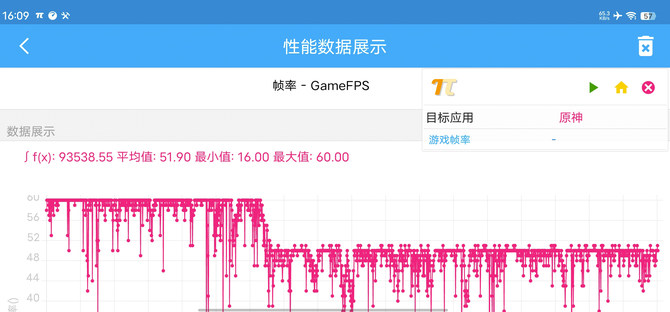 而在高负荷的原神游戏中,我们打开了最高画质与60帧,平均帧数依然有52帧左右,在温度上升后游戏帧数依然维持在50帧附近,在游戏体验与功耗间找到了一个不错的平衡点。