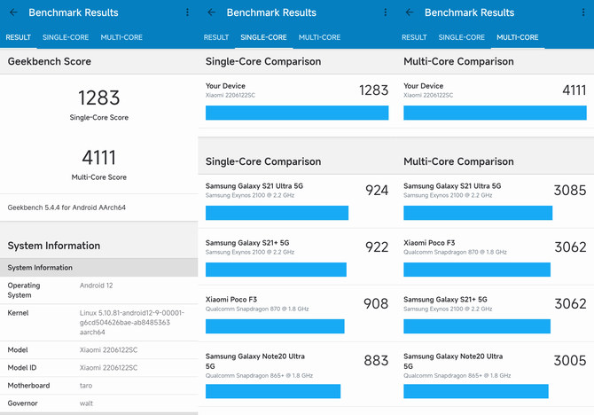 通过实际的跑分测试我们看到,在安兔兔的综合表现上,搭载第一代骁龙8+移动平台的小米12S Pro跑分就已经超过了108万分,对比骁龙8的100万左右的分数,性能有10%左右的提升。Geekbench上CPU的单核心分数达到了1283,多核成绩来到了4111,同样提升明显。