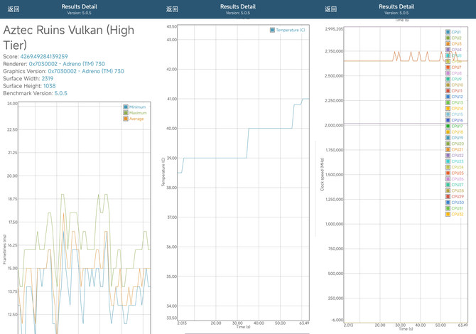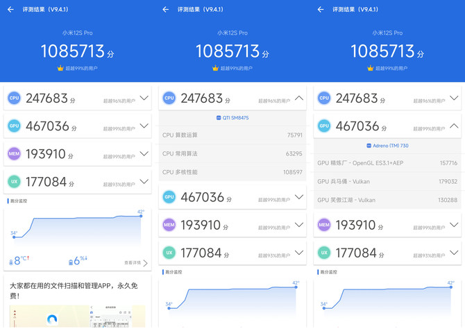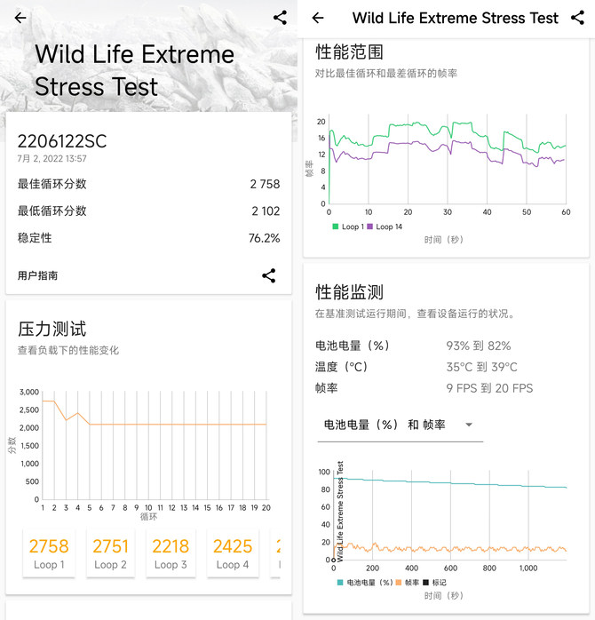 3Dmark的测试中,小米12S Pro的在Extreme Test的压力测试中也有着稳定表现,可能是由于开始测试后触发了温控墙,分数直接从2700分掉落至2200分不过在剩余时间内平滑保持在这一成绩,无明显的抖动。这也让我们看到即便是持续高负载的测试下,高通骁龙8+依旧提供了长时间稳定的表现,相比上半年的骁龙8更是进步明显。