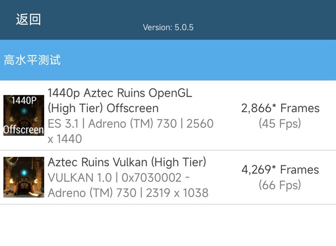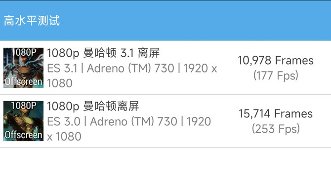 去年年底高通全新一代骁龙8移动平台最大的亮点在于GPU性能的提升上,全新一代Ardreno GPU是高通5年来第一次整体架构的升级,此次升级在游戏实时3D渲染、VR、AR、图像处理上有了飞跃的提升。新一代骁龙8+移动平台在此基础上对Adreno GPU的频率进行了10%的提升,而且得益于高通对于整体SoC的设计改进以及台积电4nm工艺,整体功耗也降低了15%。我们通过GFXbench对1440P OpenGL,Vulkan进行了测试,成绩达到了45fps和66fps,尤其是Vulkan部分的表现,在保持高性能的同时有着不错的稳定性。在曼哈顿离屏测试中,小米12S Pro更是达到了177fps(3.1)和253fps(3.0)。
