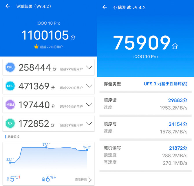 娱乐兔跑分来看,手上的12+512GB皇帝版iQOO 10 Pro,轻松跑到了110W分,这个分数已经接近带内置风扇的游戏手机。