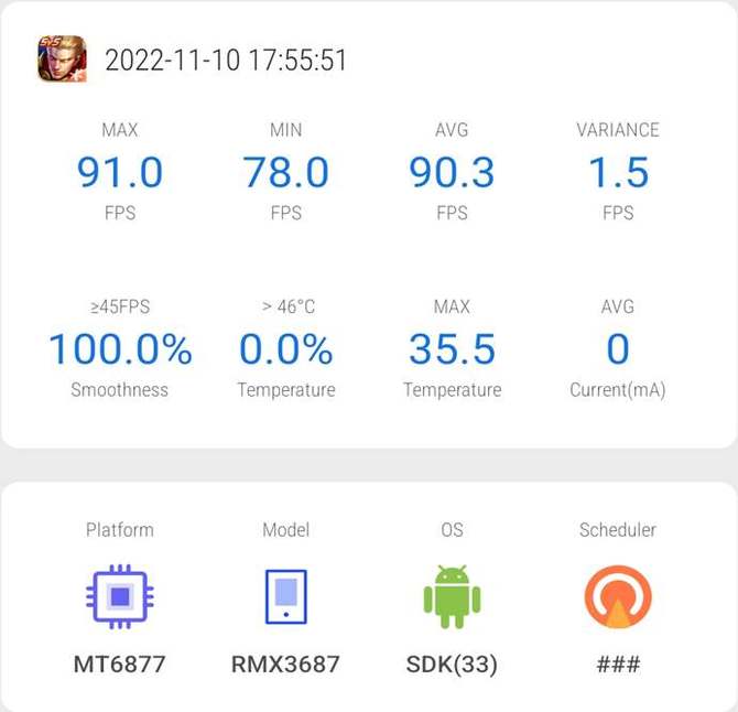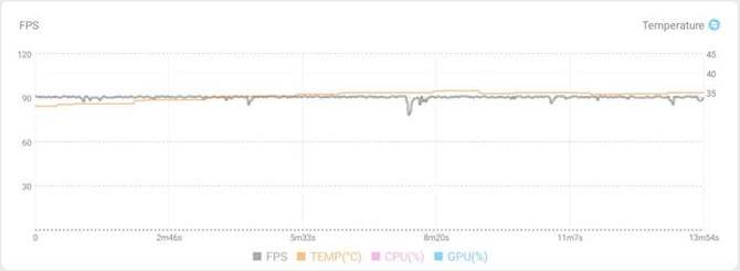 王者荣耀可以开启超高帧率(90帧)+超高分辨率,实测在均衡模式下平均帧率为90.3FPS,几乎全程跑满,中间虽有一波小动荡,但不影响实际操作,机身温度为35.5°。