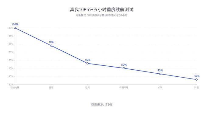 五小时重度续航测试,默认开启均衡模式,测试王者、吃鸡、哔哩哔哩、小说、抖音六个项目,每个项目测试时间均为1小时,得益于天玑1080的低功耗表现,可以看到真我10 Pro+仍有36%的剩余电量,日常使用一天毫无压力。