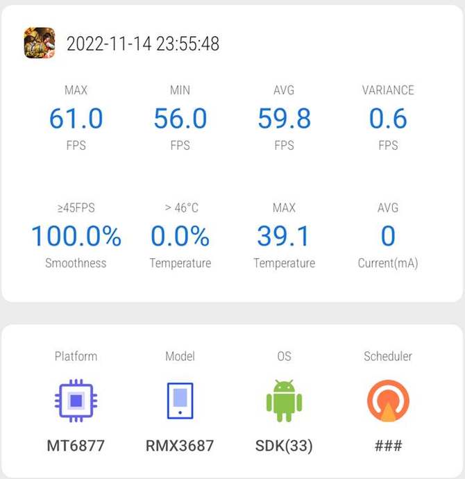 和平精英目前是流畅+极限(60帧),均衡模式平均帧率为59.8,机身温度为39.1,可以看到天玑1080的性能还是挺不错的,王者、吃鸡等主流手游都能流畅运行。