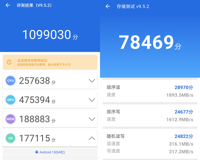 性能部分,OPPO Reno 9 Pro+搭载了新骁龙8+芯片,搭配LPDDR5+UFS3.1。安兔兔跑分轻松破百万,已经非常接近110万分。要知道专业的游戏手机分数也不过如此。