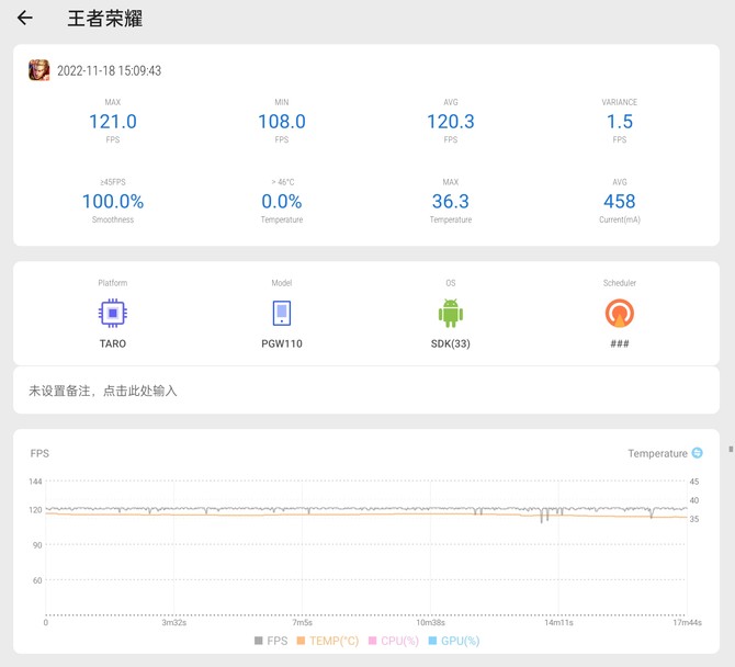 下面我们进入游戏实测,首先是王者120帧+高清画质。要不是王者只有上限只有120帧,我估计Reno 9 Pro+的成绩会更好,全程也是几乎一条直线。温度上升的也不明显,至高才32度,属于拿来暖手嫌冷的范围。