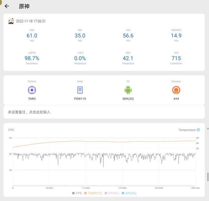 再来看看3A大作原神,打开60帧+全高画质。一开始基本上是跑满了,笔者以为Reno 9 Pro+最多能撑几分钟,毕竟大部分机子都是这么干的。但是出乎预料的是,Reno 9 Pro+这次居然是属于全程真男人的情况。平均帧率56.6帧,全程帧率略有波动,但基本都是55帧上下浮动。另外需要着重说的一点就是,这里的帧率波动主要是因为原神草元素反应的影响,熟悉的原神玩家应该知道,现在的草种子遇到其他元素激发的话,全屏爆炸伤害很可观,同时对画面的负载也很大。因此帧率波动不能全怪Reno 9 Pro+,新的元素反应也有一定责任。