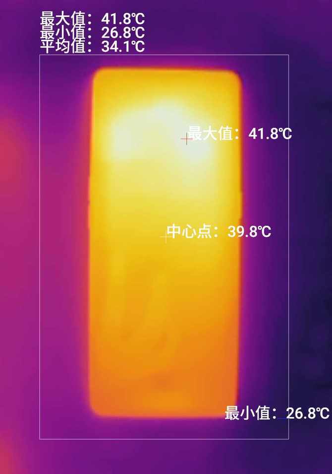 对了,关于原神的温度情况。开始的时候温升是比较缓慢的,到了大约12分钟的时候,接触机身位置的手掌会有明显的感知,屏幕也有略微有点烘手指。此时至高的温度约41.5度。正当笔者以为会继续升温的时候,估计是新的散热结构起效果了,此后的一小时原神游戏的温度就基本稳定在了这个温度附近,整个游戏至高的温度约41.8度。