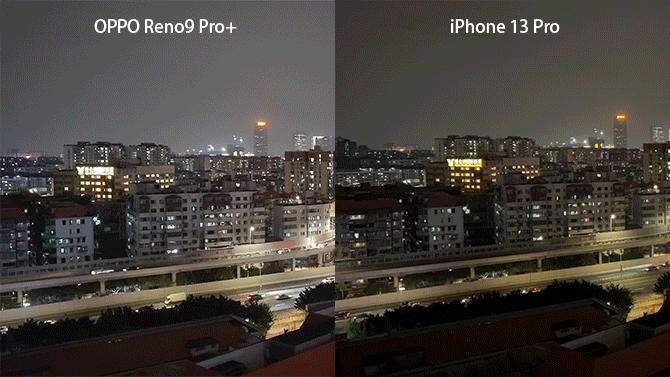 我们再对比一下iPhone,iPhone同样有4K/24帧夜景提亮模式。不过在相同场景下,OPPO Reno9 Pro+的AI视频增强效果更明显一些。不只是整体的明度,画面细节也更有优势。