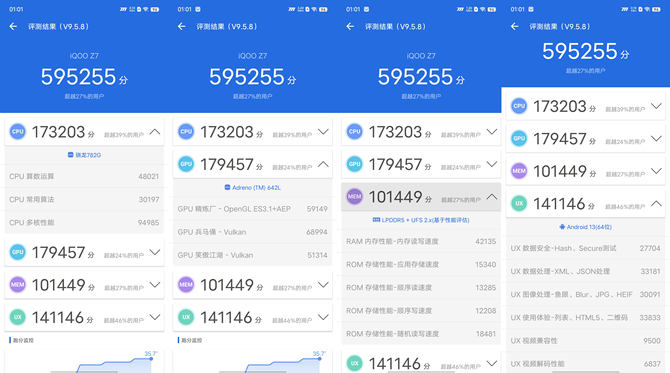 iQOO Z7搭载了骁龙782G。其实就是前中端神U-778G的继任者,相比上代,782G的CPU性能提升5%,GPU性能提升10%。实测安兔兔跑分59W+,换算下来就是接近骁龙865的水平。