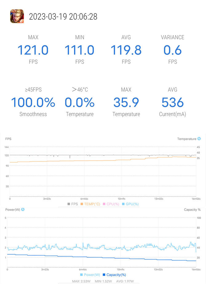 王者荣耀最 高可以开启到极高帧率+超高分辨率,实测平均帧率119.9,接近满帧运行,帧率方差在0.6FPS,这个表现还是相当不错的,要是我没记错的话,120帧满帧在千元价位应该为数不多吧。机身最 高温度为35.9°,平均功耗为1.97W,在高帧率的游戏下也有着低功耗低发热的流畅体验。