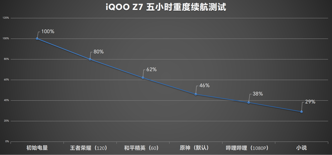 以往高功率快充往往搭配着不大不小的电池,而这次iQOO Z7还配备了一块5000mAh的大容量电池,电量有着充足的基本保障。实测五小时重度续航测试,iQOO Z7还剩余29%的电量,续航十分给力,大电池搭配120W闪充,从根本上解决续航焦虑。