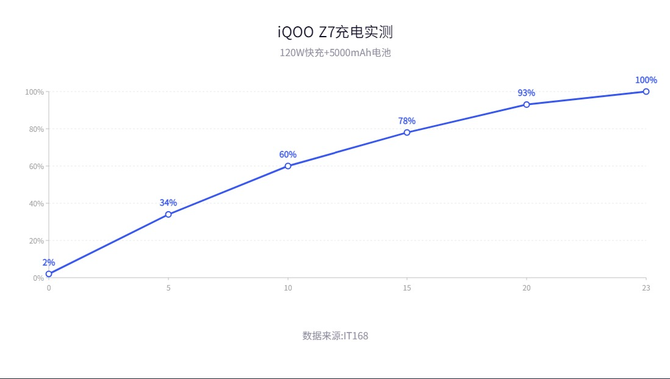 iQOO Z7升级到了旗舰专属的120W 超快闪充,实测5分钟充34%,23分钟充100%,即使早上忘记充电,仅凭刷牙洗脸的时间就已经回血一大半了。