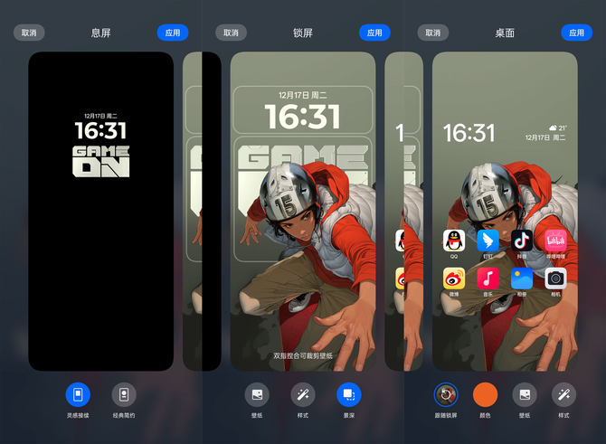 自定义方面,也是上一代系统匮乏的内容。ColorOS 15这次在系统主题上整出了不少新活儿,也是个好活儿。壁纸设置,支持拖动自动补色,还有景深抠图效果,锁屏界面也可以自主编辑附加信息、时钟样式以及字体等等,最后搭配灵感接续的息屏,每个用户都可以自定义搭配出个性的主题。