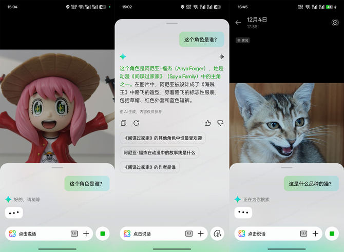 今年厂商们都在不留余力的推广AI,在ColorOS 15的AI玩法中,让人印象深刻且非常实用的功能是一键问屏,屏幕内外同样智慧好用。遇到不清楚或者不熟悉的事物,之前用户要么拍下来上网搜图,或者手动添加描述性词汇搜索。而在ColorOS 15则是可以在屏幕内直接问小布,也可以打开摄像头一键问屏,系统会自动识别屏幕里或者镜头里的内容,并给用户提供参考答案。像日常中这种恶搞系列的手办,通过相机的一键识屏也能提供精准的答案。