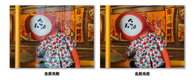 另一个使用频率高的AI玩法,在相册里,照片编辑界面的AI图像助手里,有之前熟悉的AI消除,以及新增的三个功能,AI去拖影、AI超清像素以及AI去反光。拿AI去反光来举个例子,用户在拍一些隔着玻璃拍模型的情形,往往很难规避掉玻璃的反光,这个时候ColorOS 15的AI能帮用户去除影响观感且多余的杂光,保证画面的干净清晰。