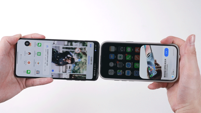 除了在社交媒体分享,OPPO还打通了和苹果的互传壁垒。只需要开启蓝牙、NFC,一碰互联开关,iPhone可以不用提前打开“O+互联”应用,轻轻一碰就能完成传输分享。简单高效的同时,实况动图的效果也能保留。