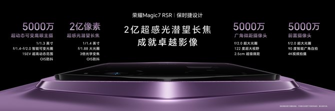 荣耀Magic7 RSR保时捷设计版,在本次发布会上也公布了完整的产品规格,除了联合全球享负盛名的奢华创新品牌“保时捷设计”精心打造的运动美学外观外,该产品搭载行业领先长焦光圈、行业领先的双电磁对焦马达等影像配置,协同全新升级的大王影像系统,成为荣耀影像技术集大成的巅峰之作,为用户带来超越想象的非凡摄影体验。