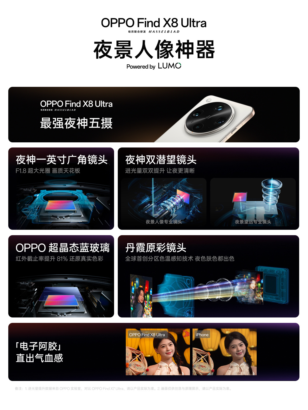 其他方面,Find X8 Ultra采用了独特的超光影五摄设计,五颗镜头分别为夜景人像专业镜头、丹霞原彩镜头、夜景望远专业镜头、一英寸超大底镜头以及大光圈超广角镜头。性能方面搭载了潮汐引擎加持的骁龙8至尊版处理器,堪称性能天花板;续航方面,该机内置超大容量双电芯6100mAh冰川电池,支持100W有线、50W无线双超级闪充;另外还有仿生超震感马达、超声波指纹,支持IP69 & IP68级防尘抗水等等。