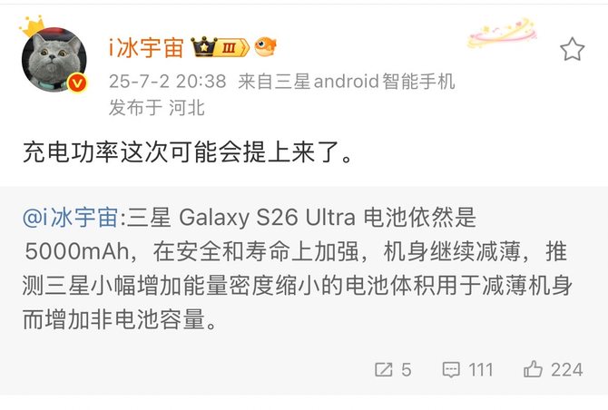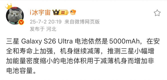 根据国内数码博主 @i冰宇宙 的透露,三星 Galaxy S26 Ultra 电池依然是5000mAh,在安全和寿命上加强,机身继续减薄,推测三星小幅增加能量密度缩小的电池体积用于减薄机身而增加非电池容量。并且充电功率这次可能会提上来了。