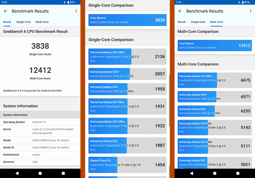 连续的三轮测试,GeekBench 6的单核心成绩为3838,多核心成绩为12412,这个成绩相对于高通上代至尊版同样提升非常明显,并且横向对比现在的天玑9500,同样是有明显的领先优势。