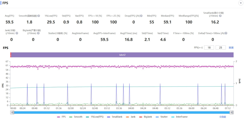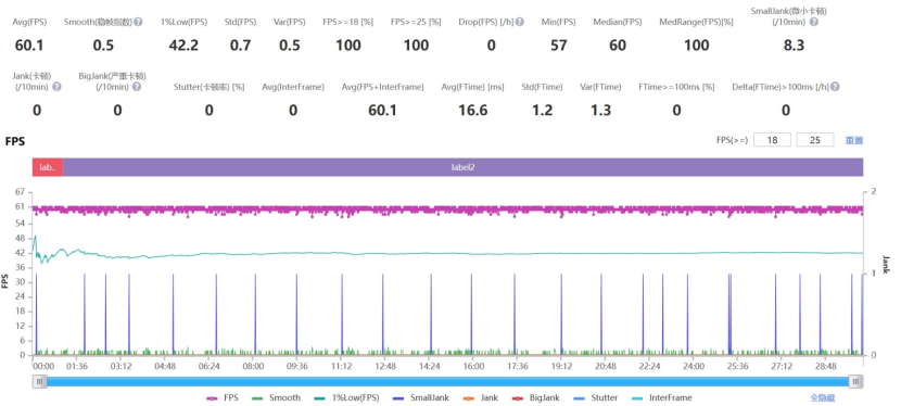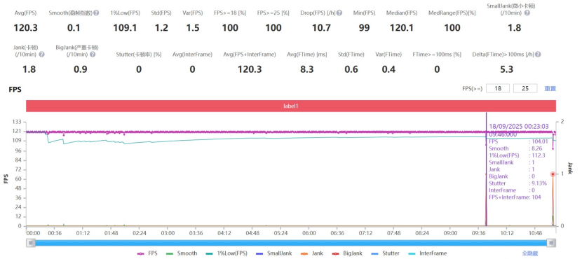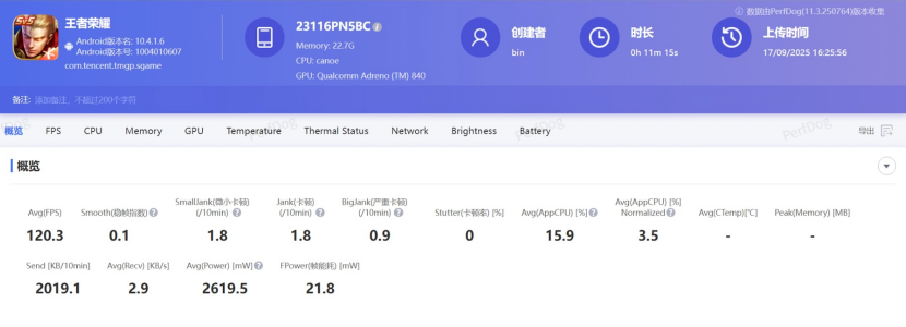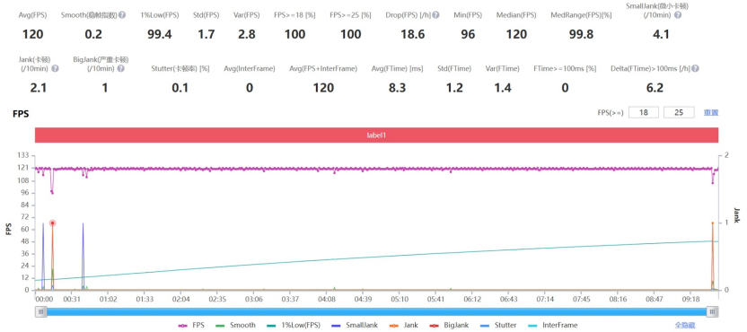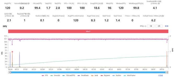 可以看到在《王者荣耀》测试中,游戏帧数稳定在120.3FPS,帧率稳成一条直线,我们选择了低一档位特效的情况下,功耗为2.69W。