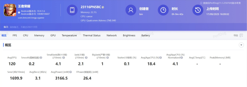 后续我们测试了「极致」特效下的游戏帧数和功耗,在极致特效下,《王者荣耀》的帧数同样稳定在120FPS,并且此时的功耗为3.16W,性能释放同样到位且稳定。