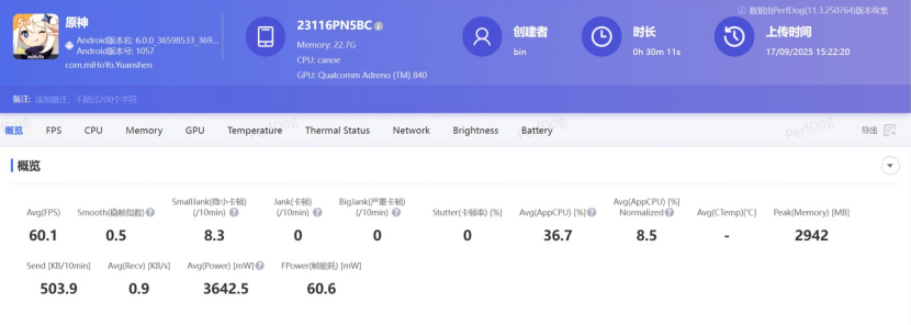 《原神》测试中我们可以看到在特效拉满的情况,测试路线为枫丹-开船的场景,游戏平均帧数为60.1FPS,帧率稳成一条直线,并且1%LOW帧为42.2FPS,游戏的平均功耗为3.62W,并且高通同样支持和各大终端游戏厂商合作进行超分超帧的游戏,比如小米、一加等,用户可以获得更加精致的画面和更为流畅的游戏表现。
