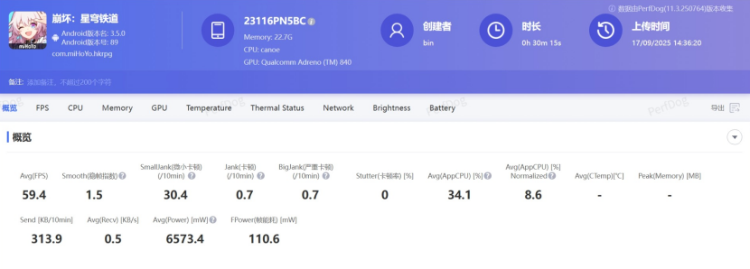 高强度的星铁测试中,我们可以看到,在特效拉满的情况下,我们能够看到游戏的平均帧数为59.4FPS,并且此时的功耗仅为6.57W,测试场景我们选择了黄金时刻广场跑图,在实际的游戏性能表现上,毫无疑问是旗舰级的水准,并且帧率也同样非常稳定。