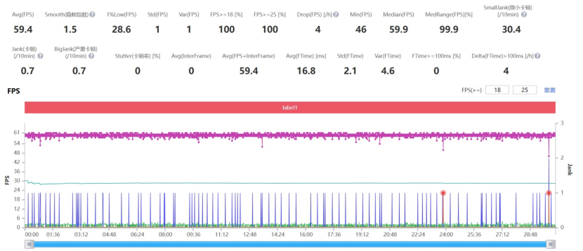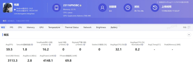 《鸣潮》我们同样选择极高画质60FPS的模式,在中曲台跑图的时候,游戏的平均帧数为59.5FPS,游戏的平均功耗为4.14W,全程游戏帧数非常稳,没有明显的大幅波动,游戏性能表现非常出色。