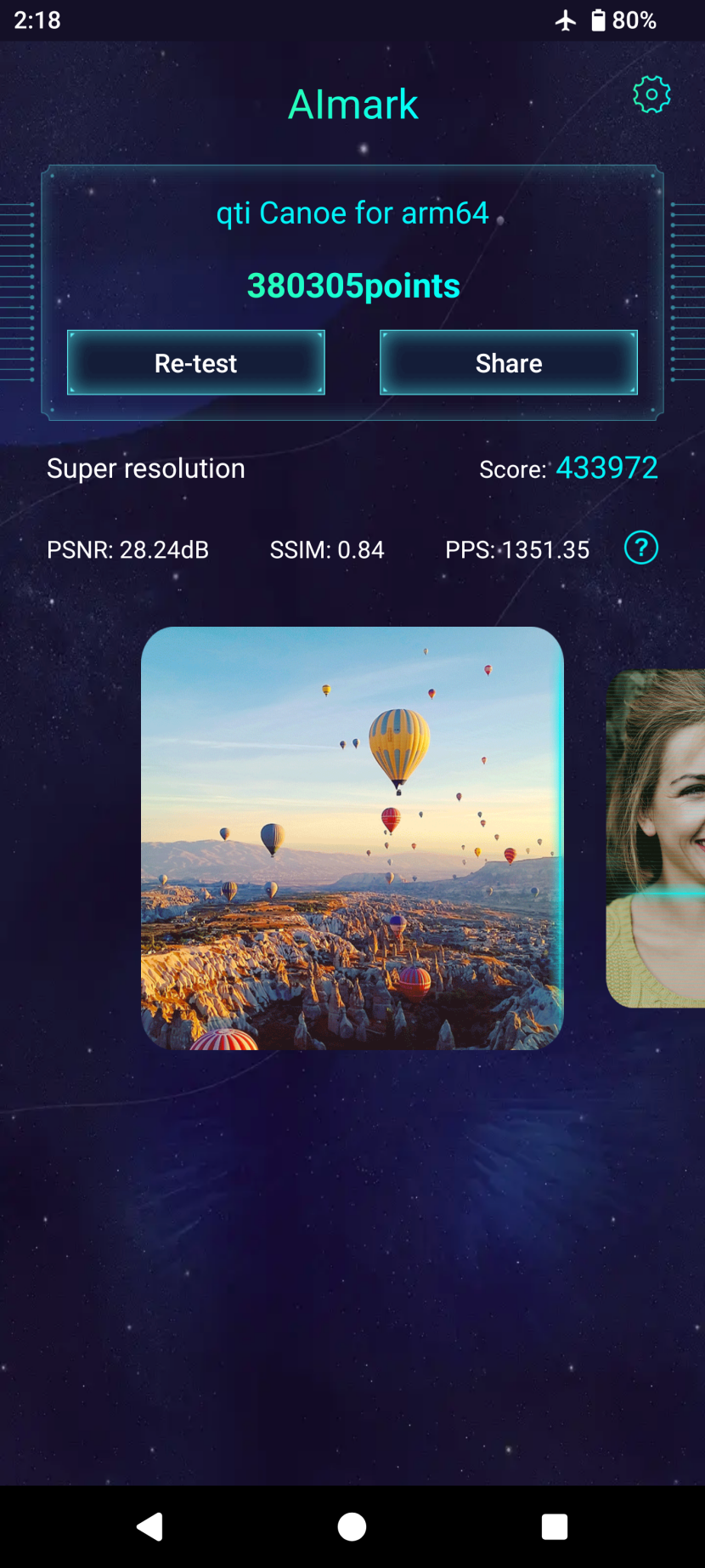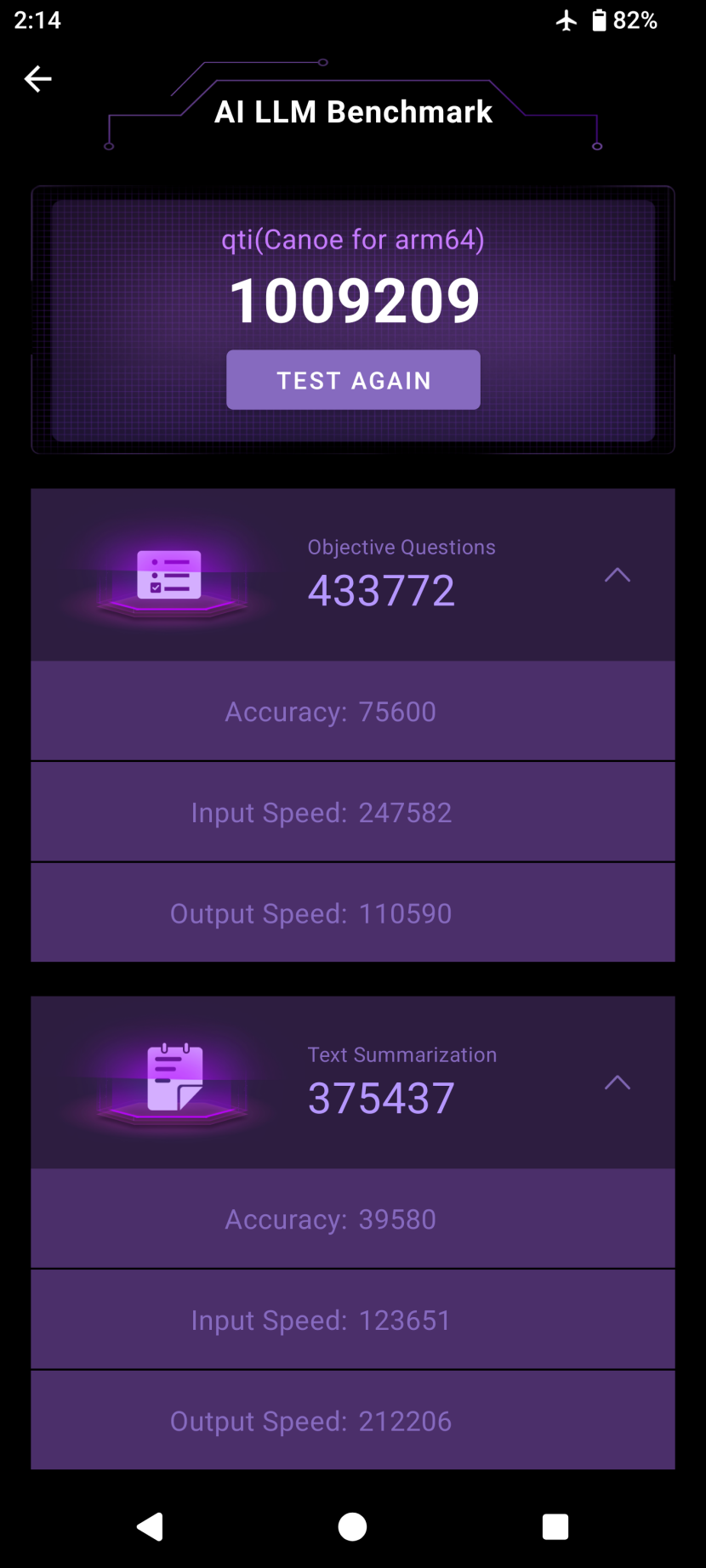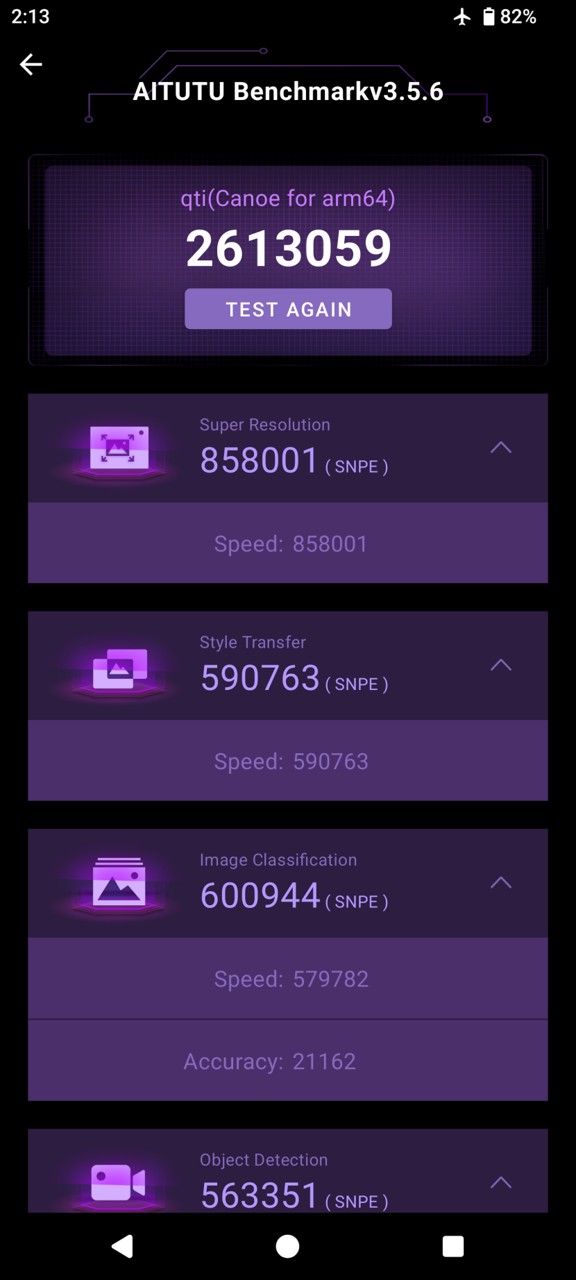 首先我们测试了AIMark,可以看到分数达到了38W,这项测试是考量整个平台的人工智能性能的软件,通过各类神经网络模型来测试整个算力表现,从最终38W的分数来看,高通第五代骁龙8至尊版的AI水平非常优秀,能够轻松胜任绝大部分的端侧AI计算和大模型运行。
