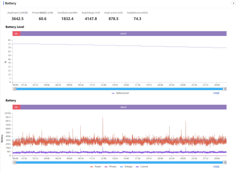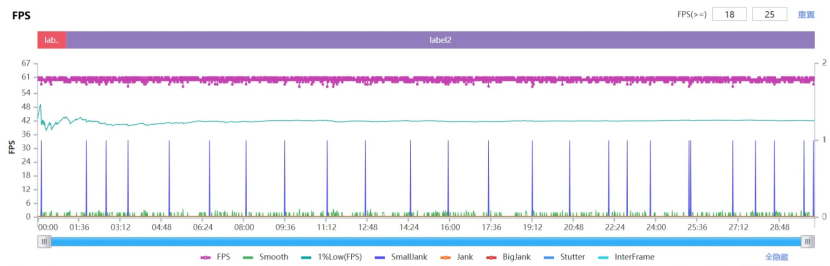 从游戏帧数上来看,原神固定场景跑图的游戏帧数基本上稳定在60FPS左右,跑图时间为固定路线的10分钟,这个时候的平均功耗为3.6W,机身温度为42摄氏度。