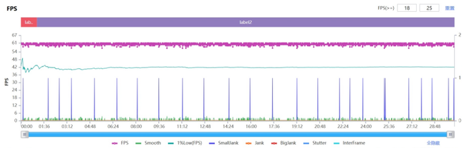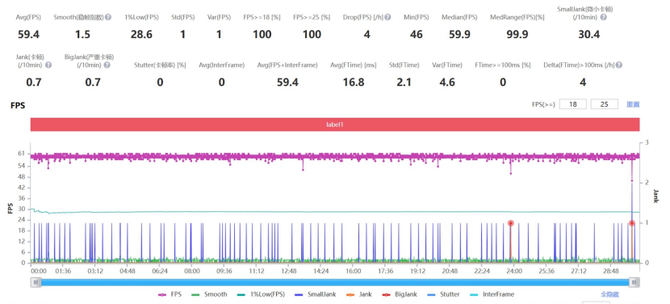 游戏帧数表现方面,平均的游戏帧数为59.4FPS,功耗为6.57W,性能表现非常出色,并且帧数非常稳定,没有太大波动,机身的温度也仅为43摄氏度。